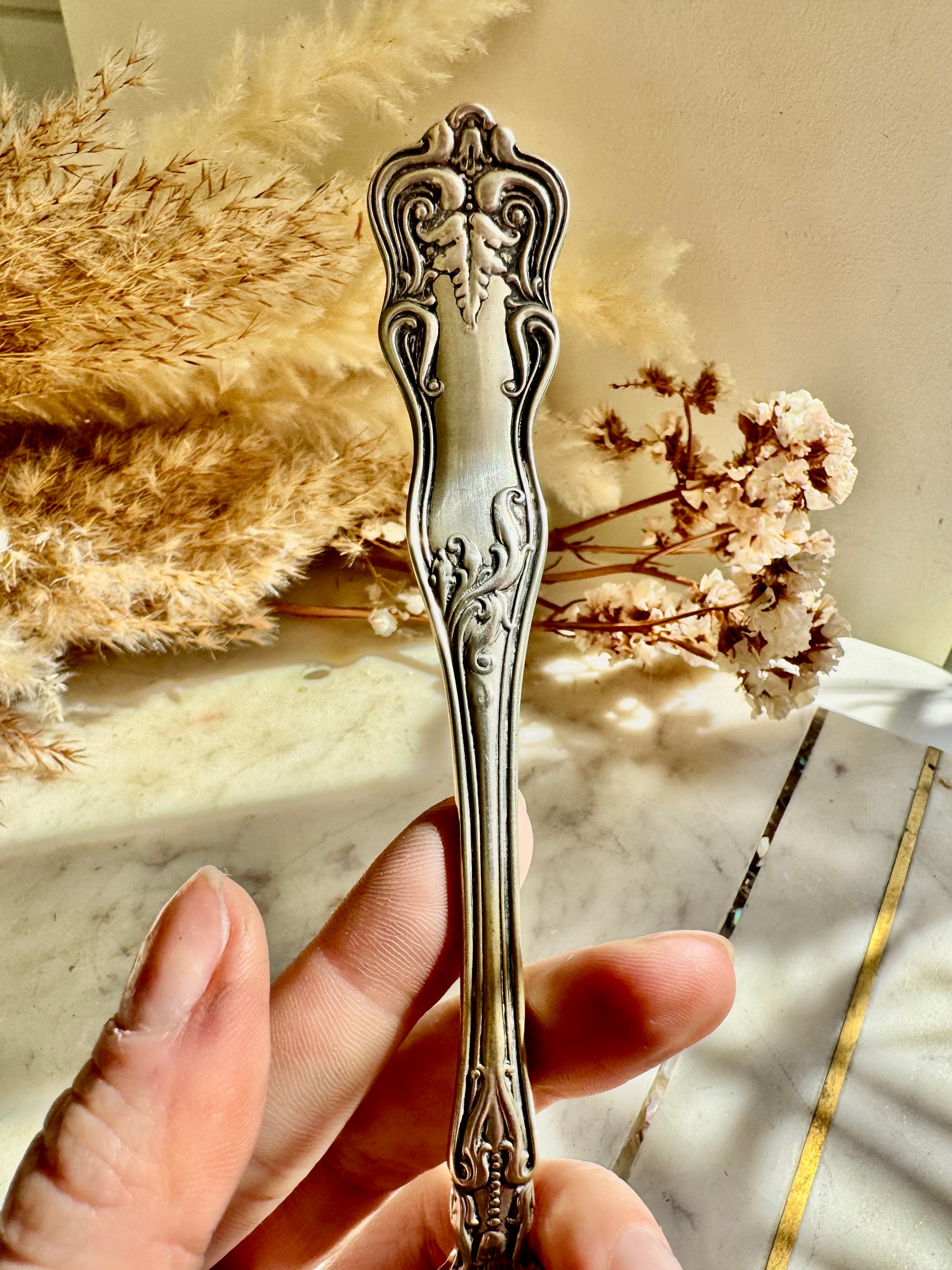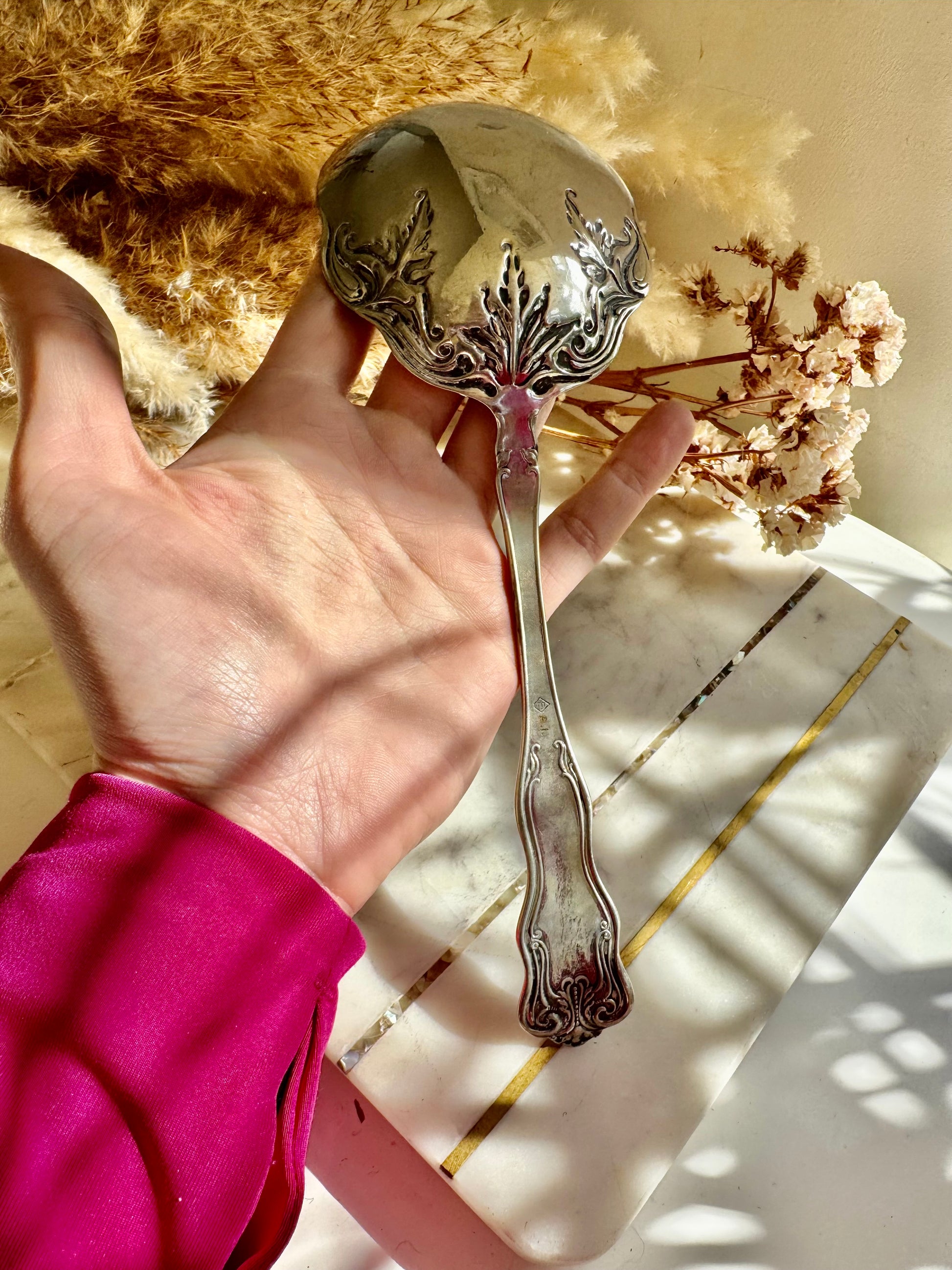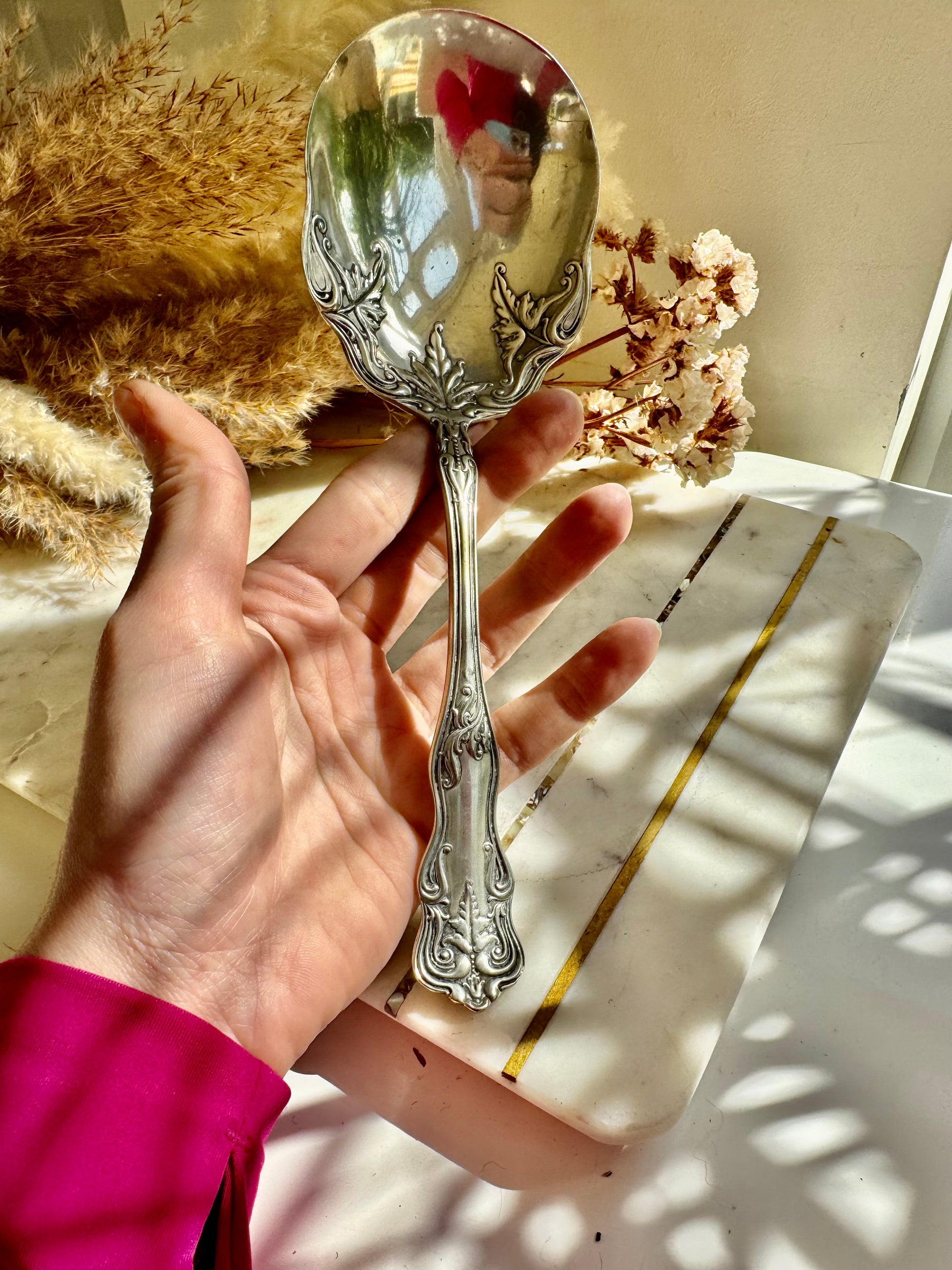A rare English serving spoon in the Art Nouveau style, featuring sweeping botanical reliefs of acanthus and curling leaves. The bowl is deep and wide, ideal for generous helpings of vegetables, puddings, or compotes. The ornate handle is weighty, elegantly curved, and ends in a stylised finial reminiscent of Tudor foliage.