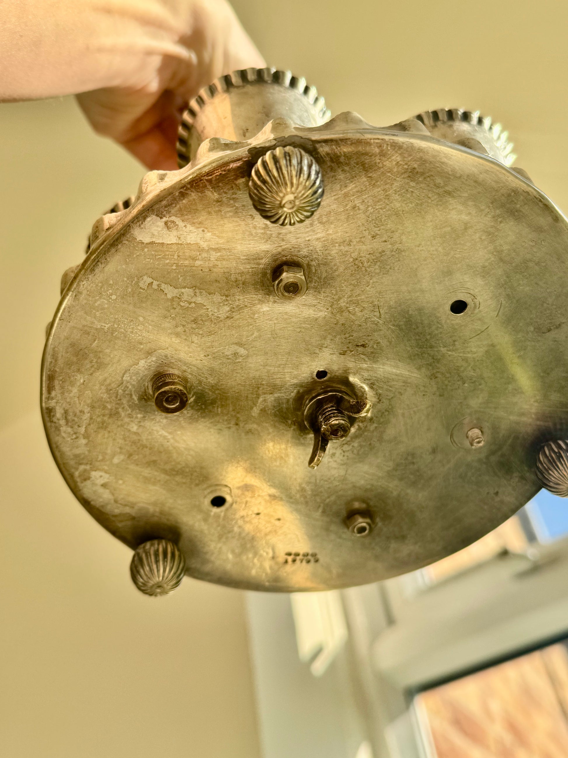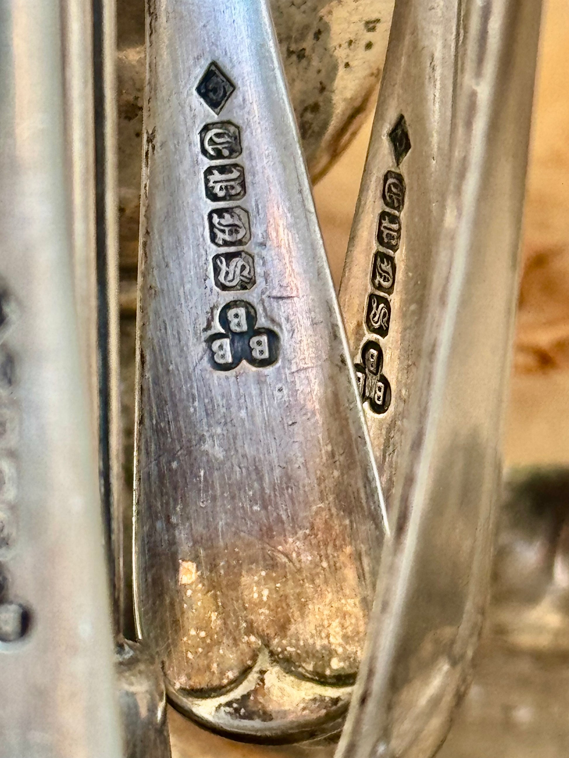 A rare Edwardian egg cruet set crafted in silver plate by William Batt & Sons of Birmingham, circa 1900. The set features six fluted egg cups and matching teaspoons arranged on a round footed tray with a decorative clover-shaped handle. Each spoon is hallmarked with the maker’s initials and signature trefoil mark. A refined and practical piece, designed for elegant breakfast service.