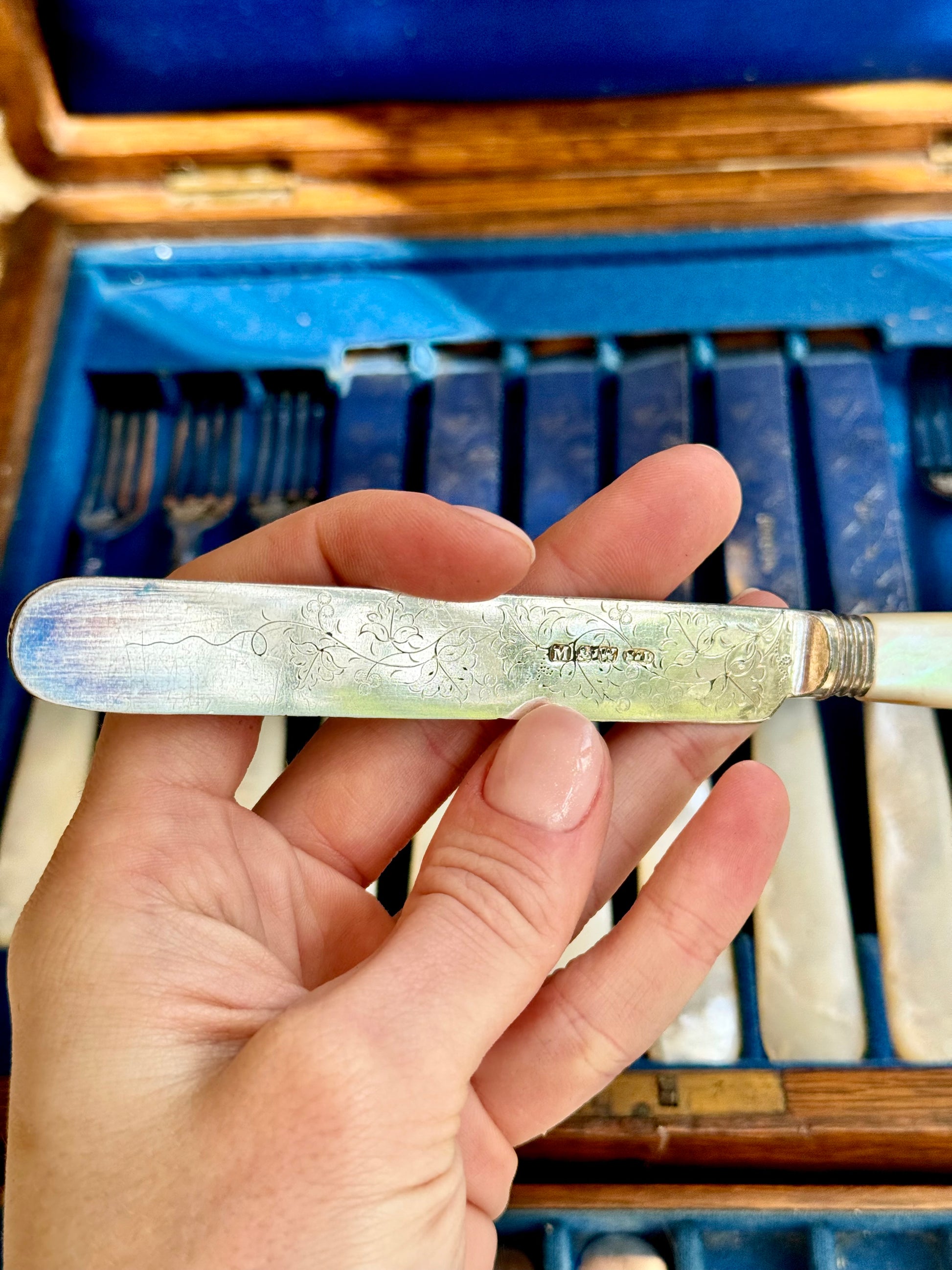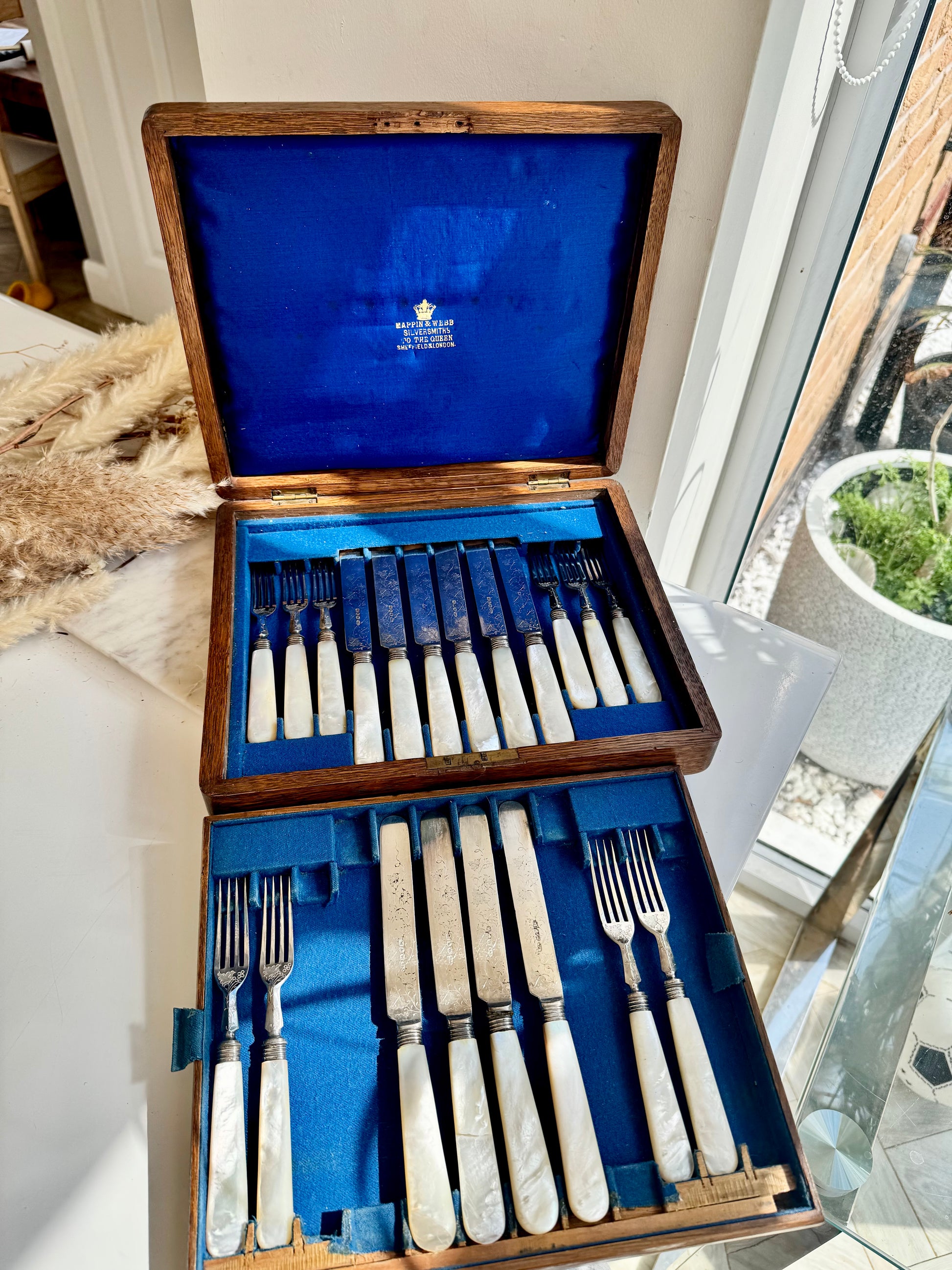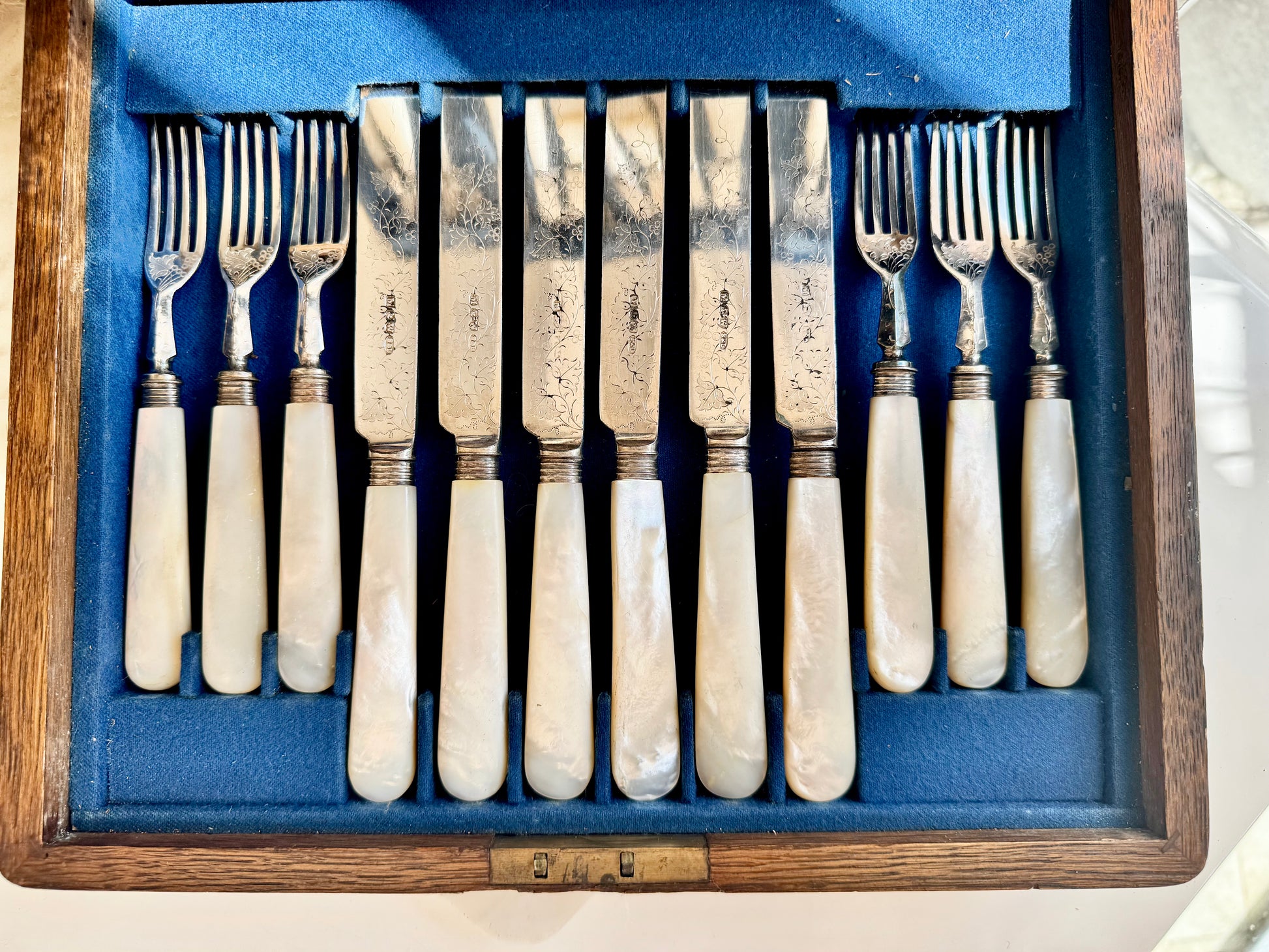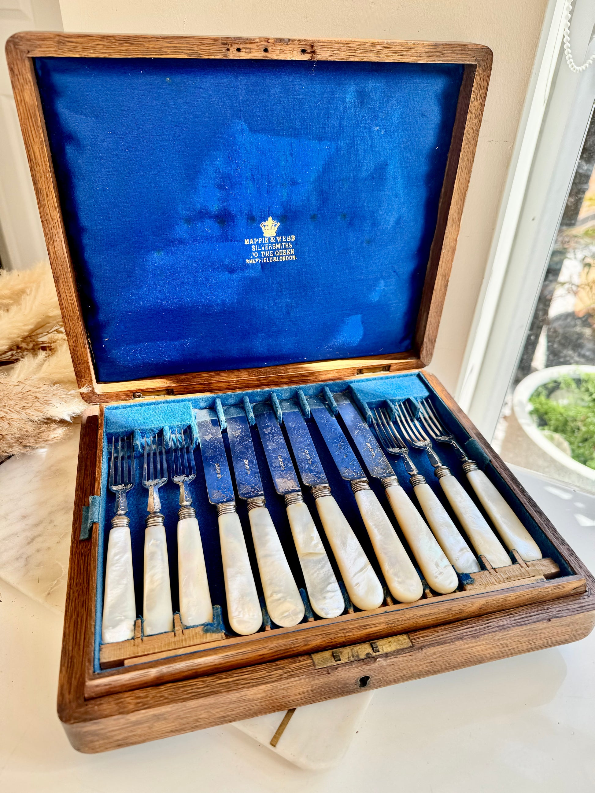 Antique Mappin & Webb Cutlery Set – Mother of Pearl Handles – c.1900s – Oak Case