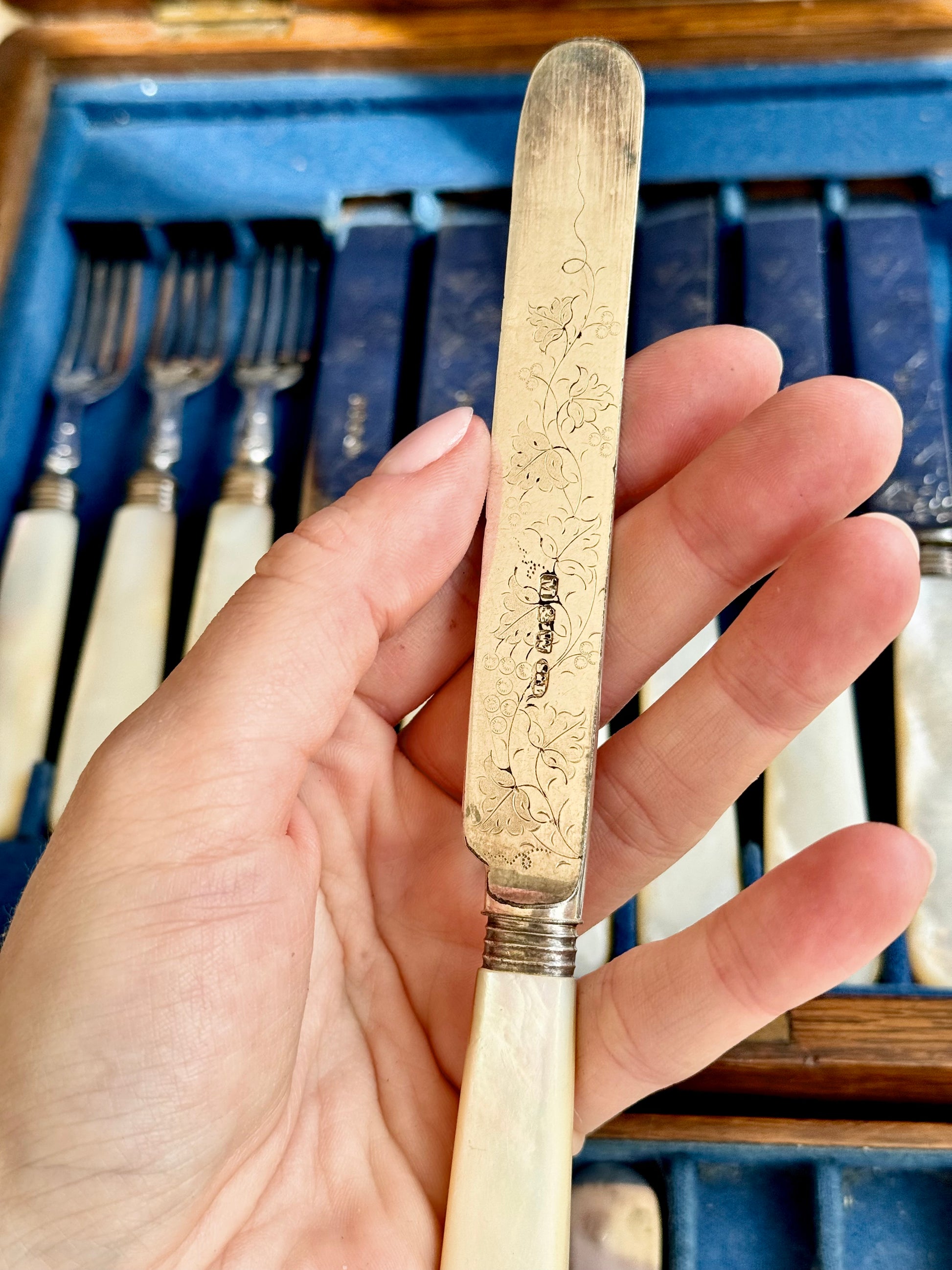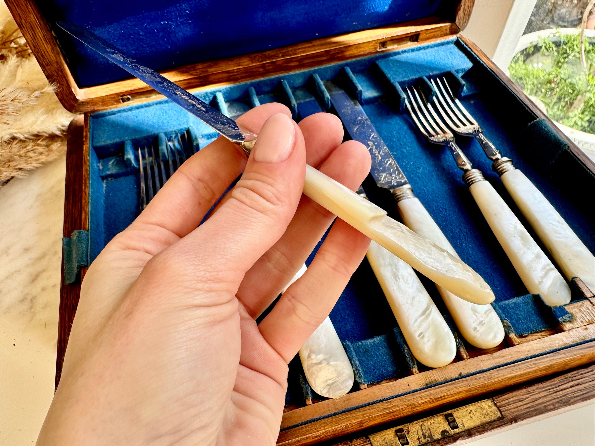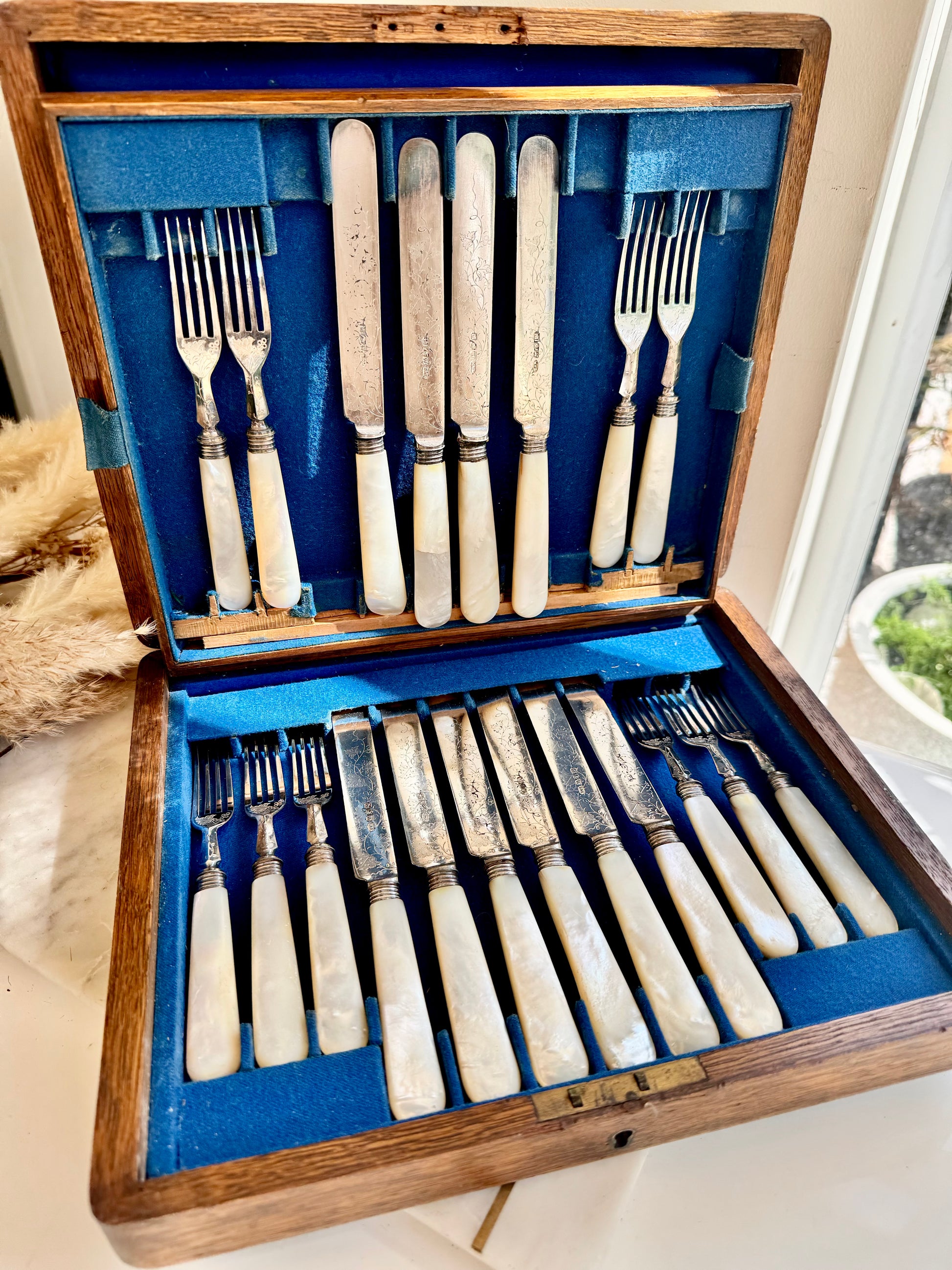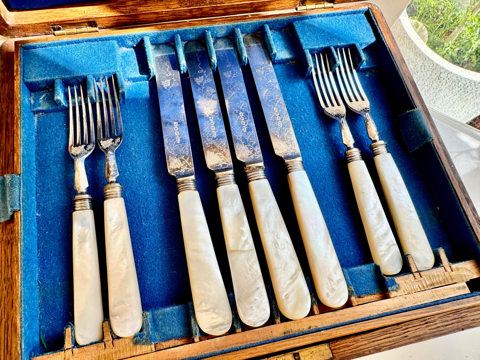Antique Mappin & Webb Cutlery Set – Mother of Pearl Handles – c.1900s – Oak Case