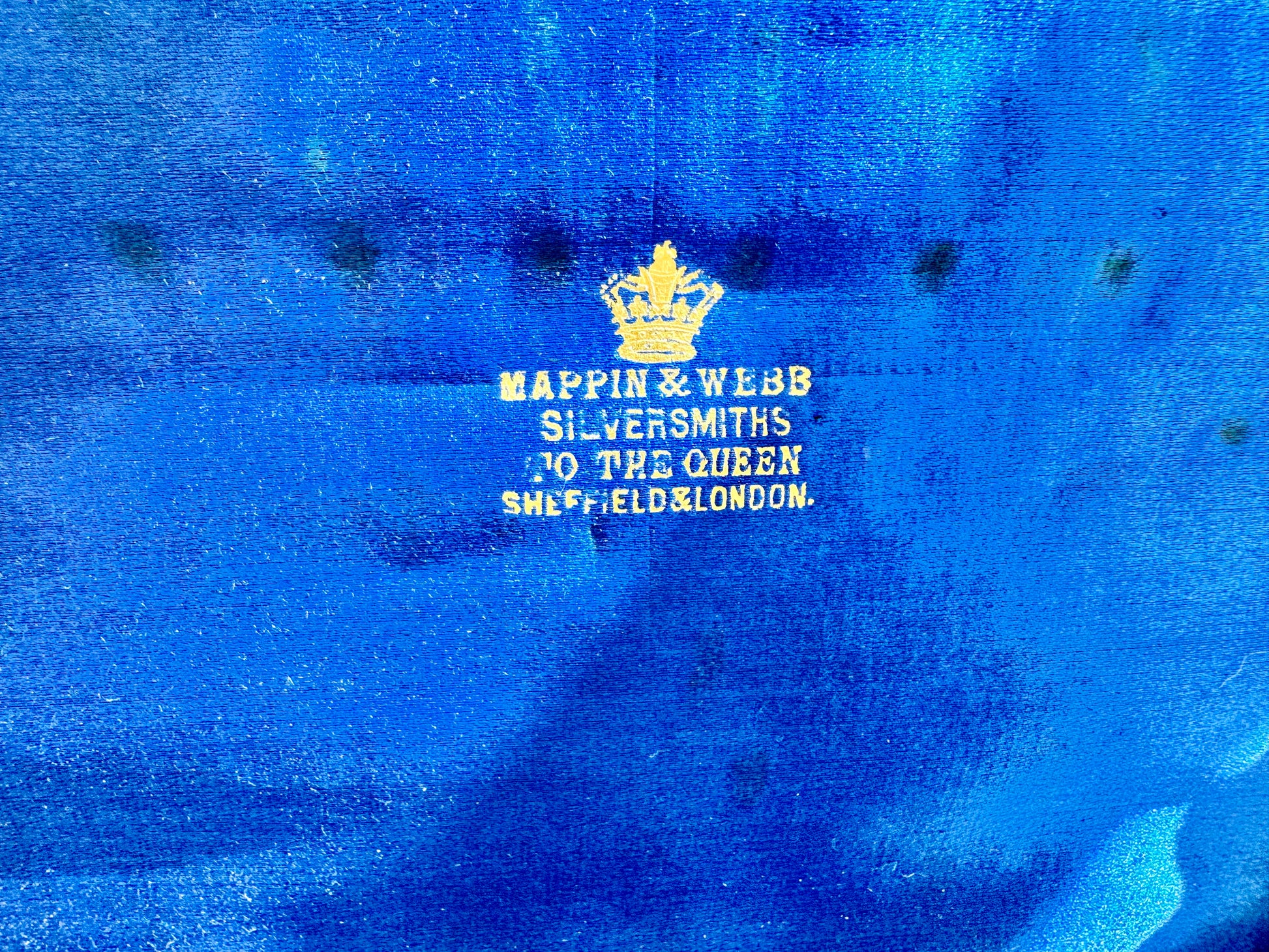 Elegant antique cutlery set by the royal silversmiths Mappin & Webb, dating to the early 1900s. Each piece features a lustrous mother-of-pearl handle and finely engraved silverplate blade or fork. Housed in the original oak case with vivid royal blue velvet and silk interior, marked “Silversmiths to the Queen.”
