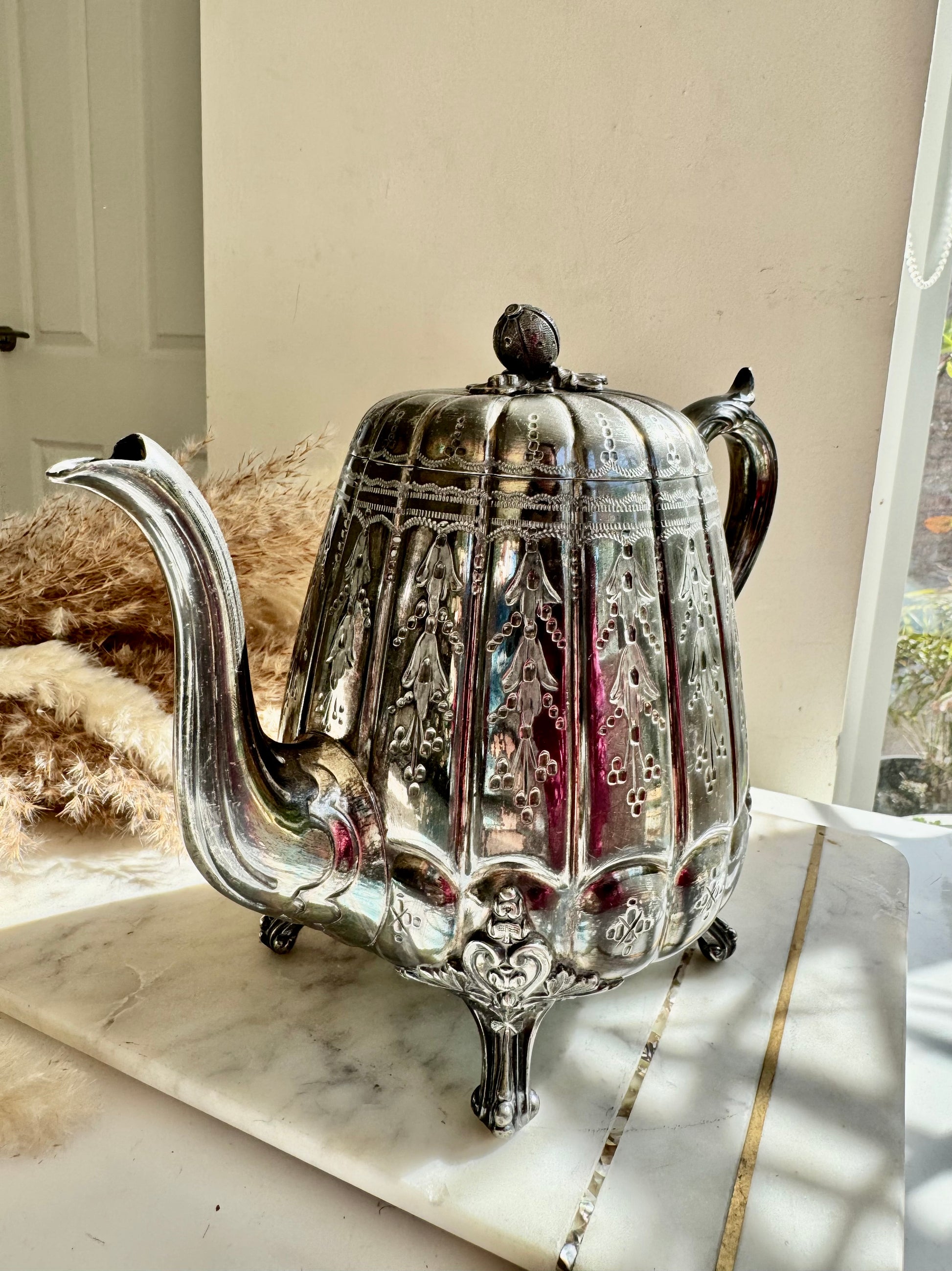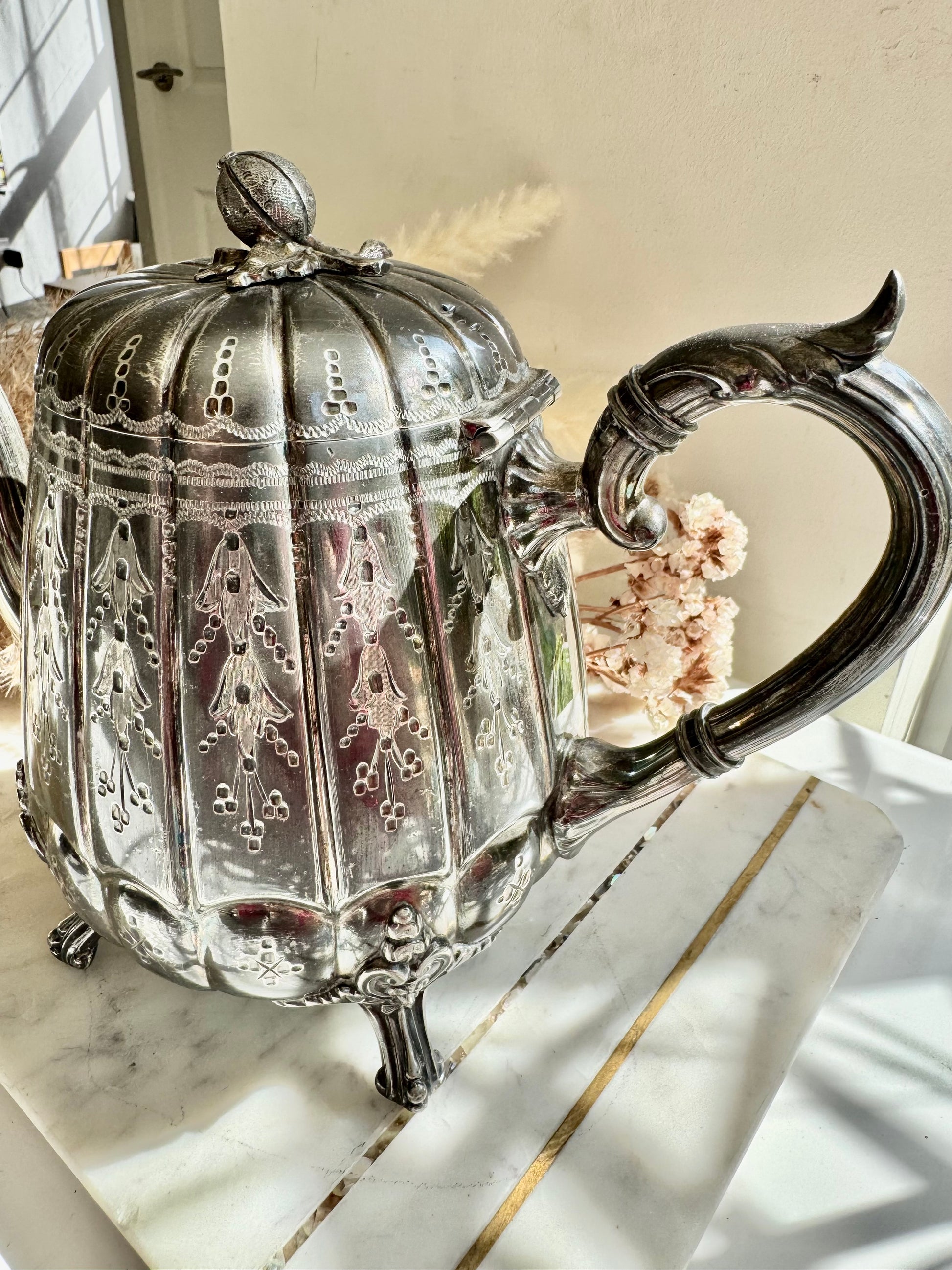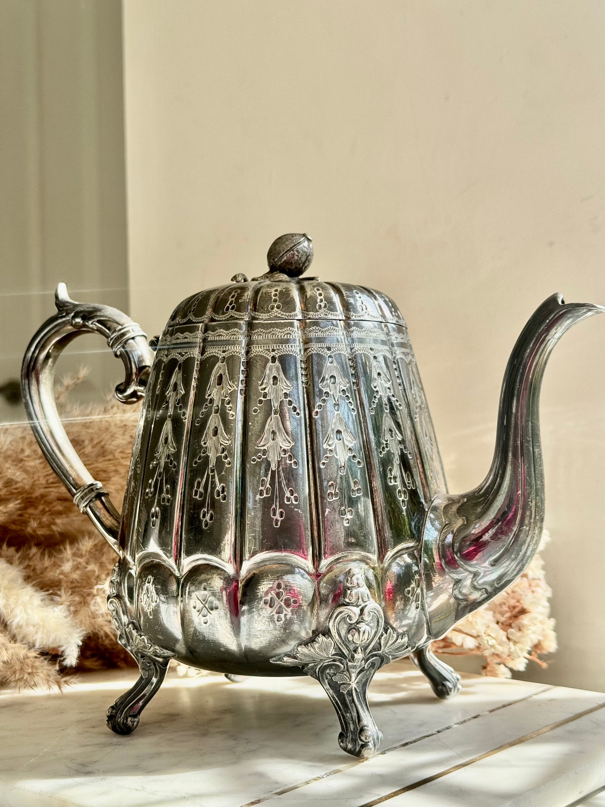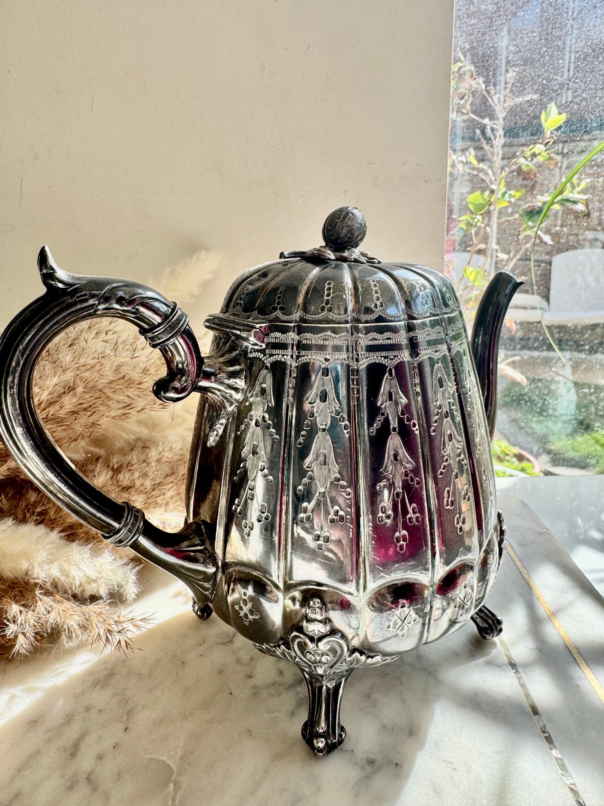 Antique James Deakin & Sons Silver Plated Teapot – Floral Engraved, Tripod Feet, Sheffield c.1890s