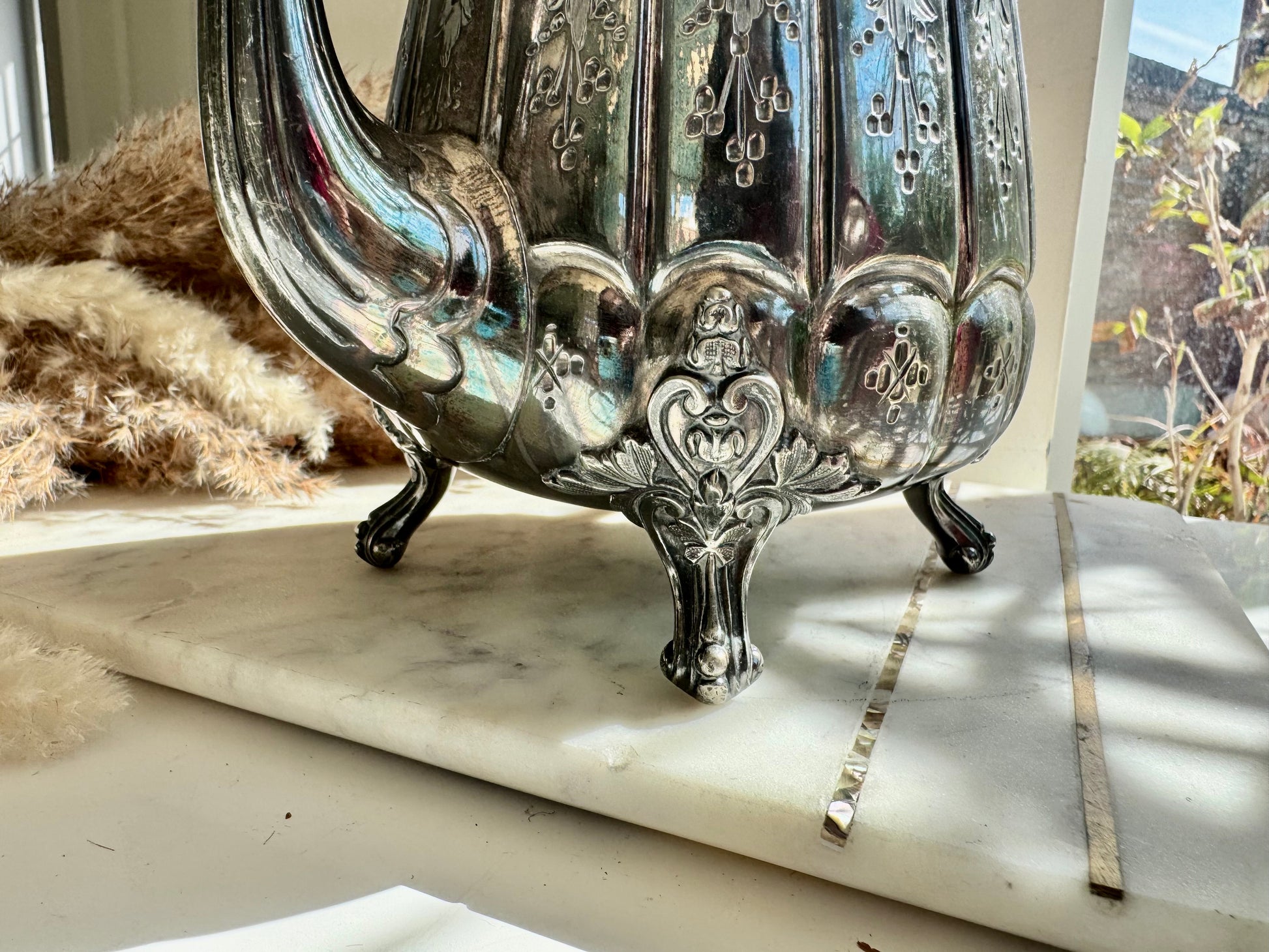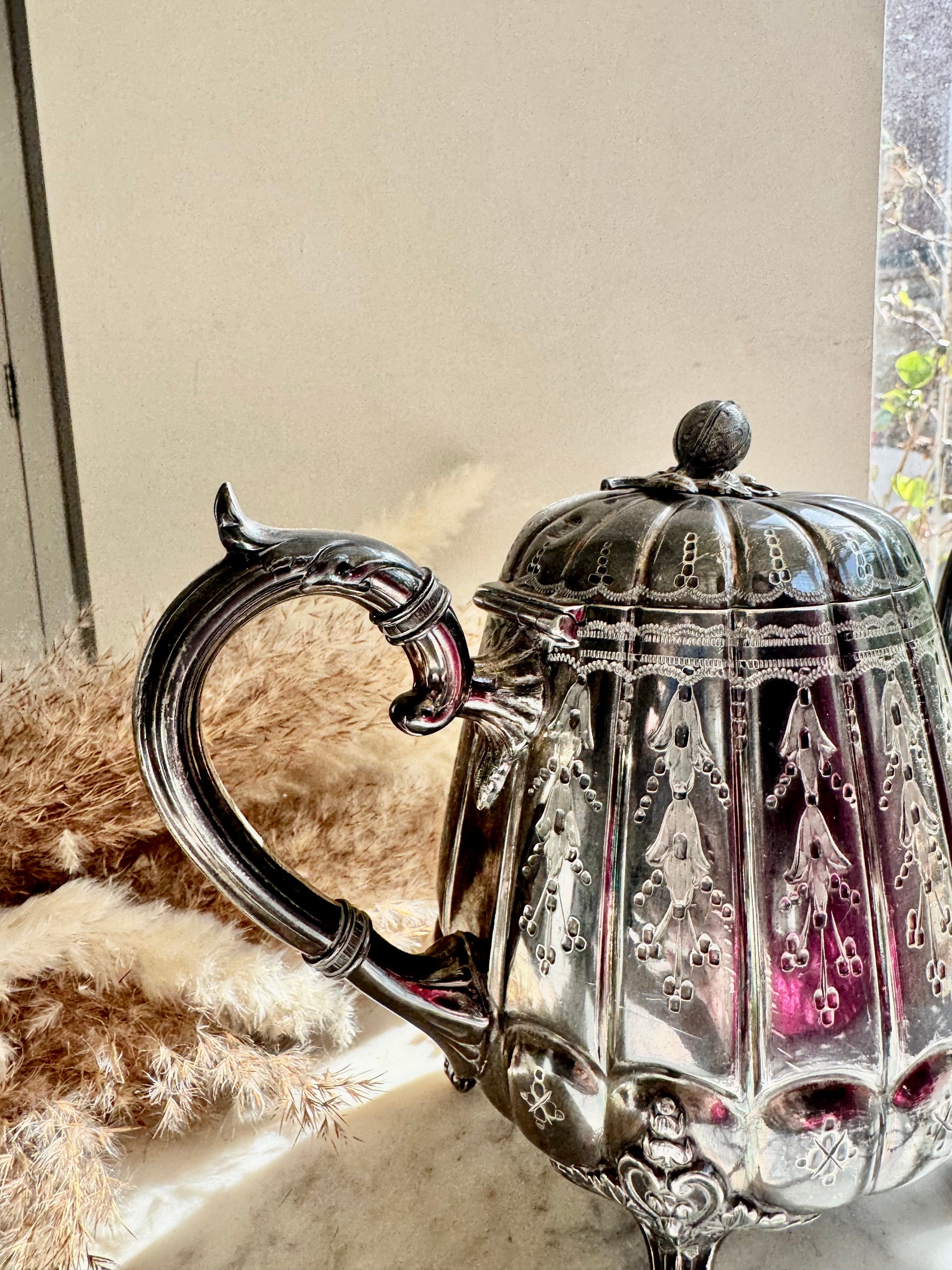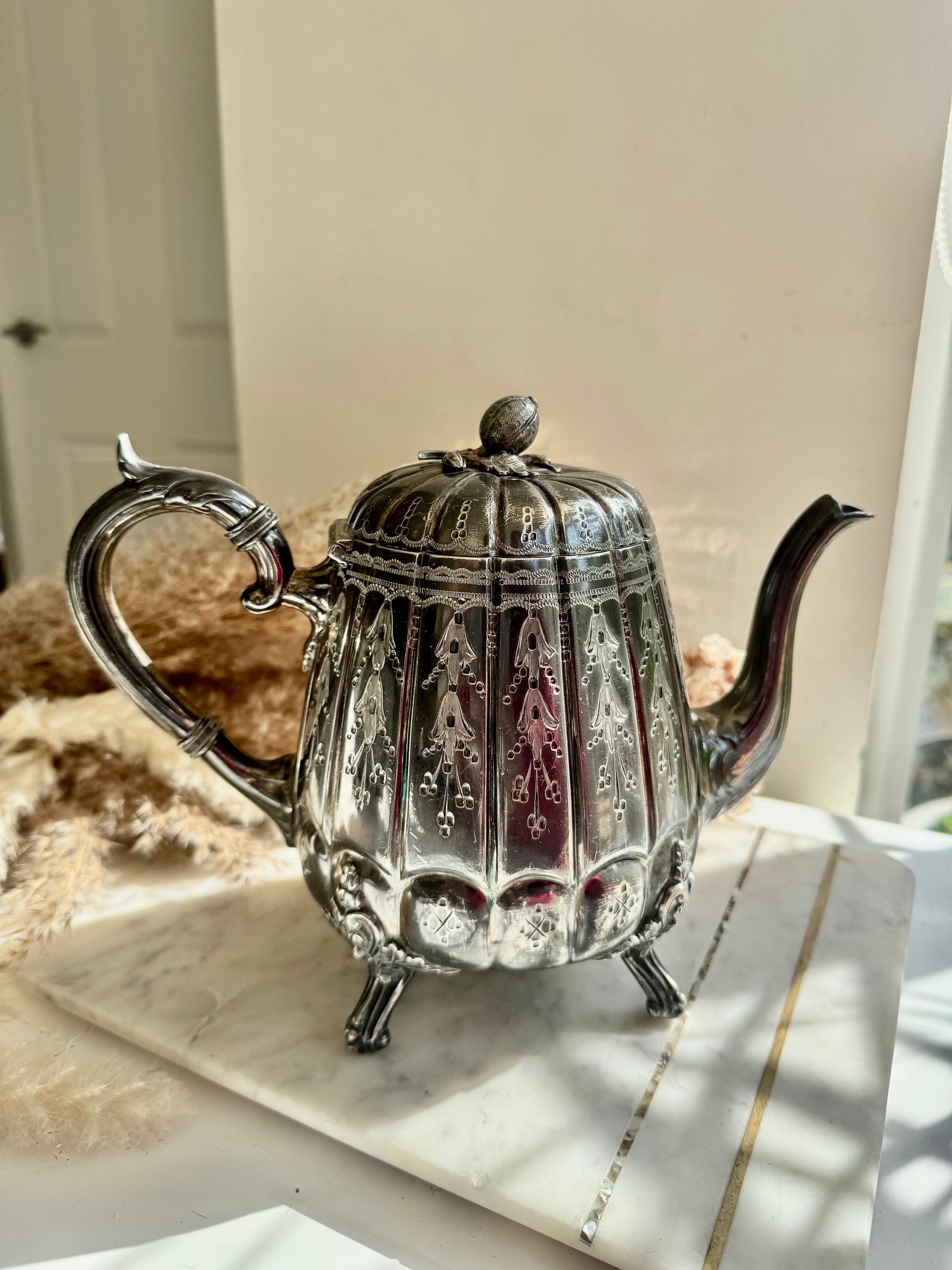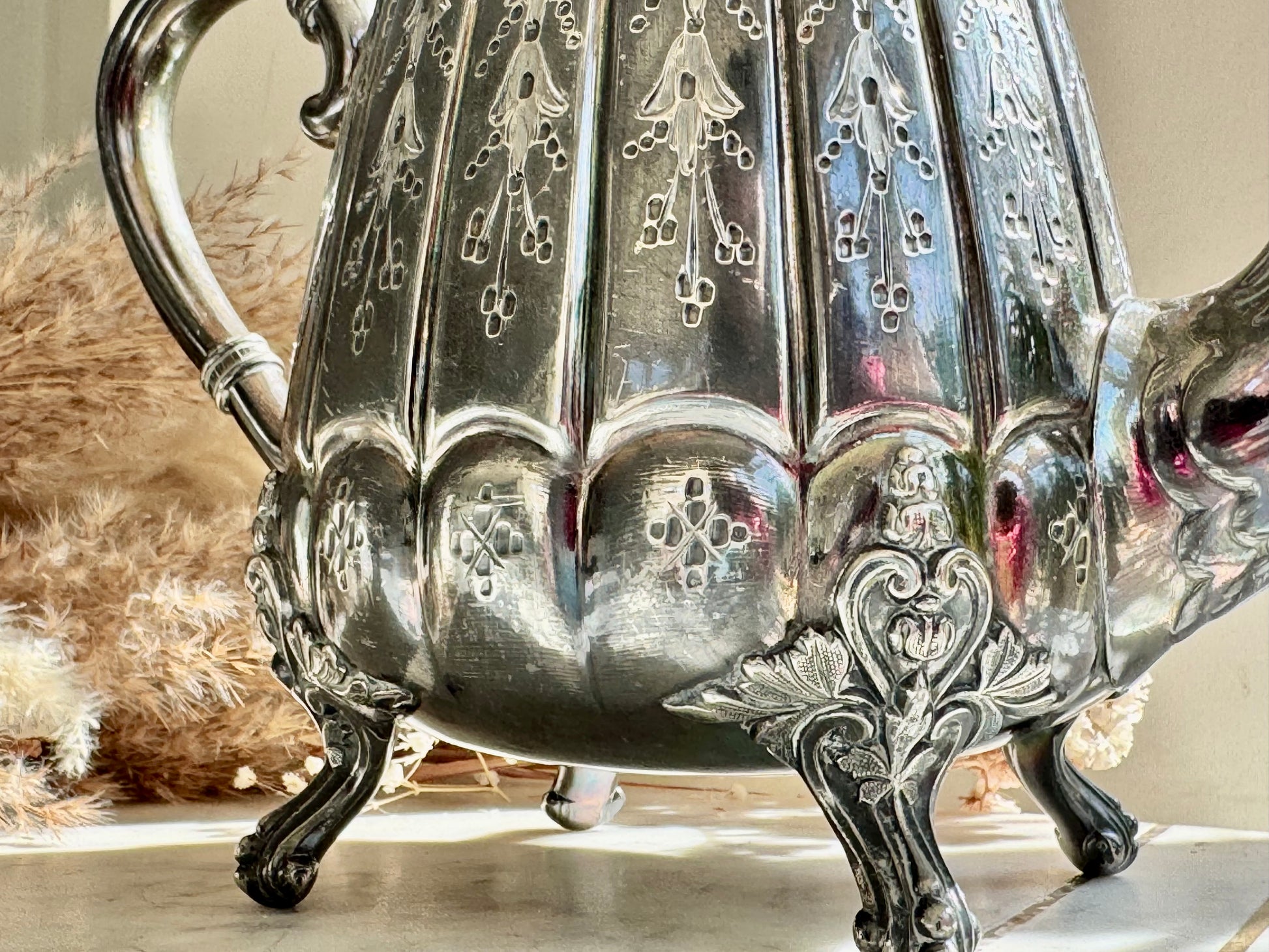 Antique James Deakin & Sons Silver Plated Teapot – Floral Engraved, Tripod Feet, Sheffield c.1890s