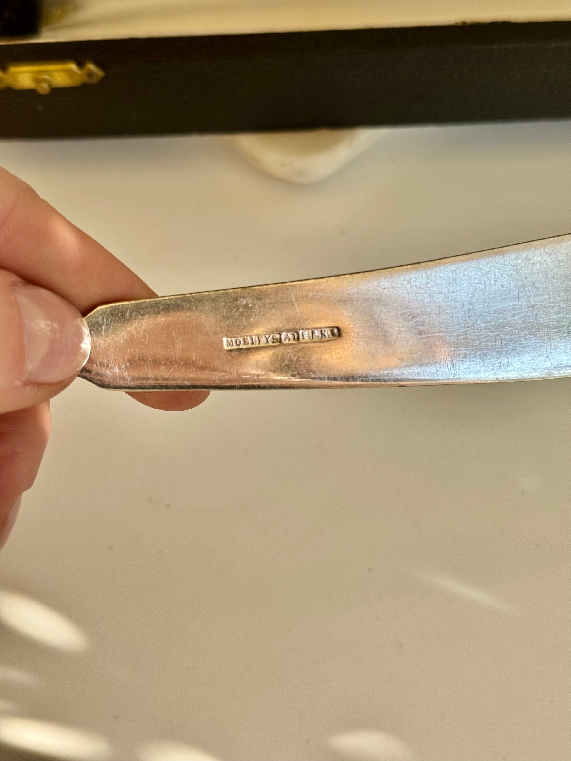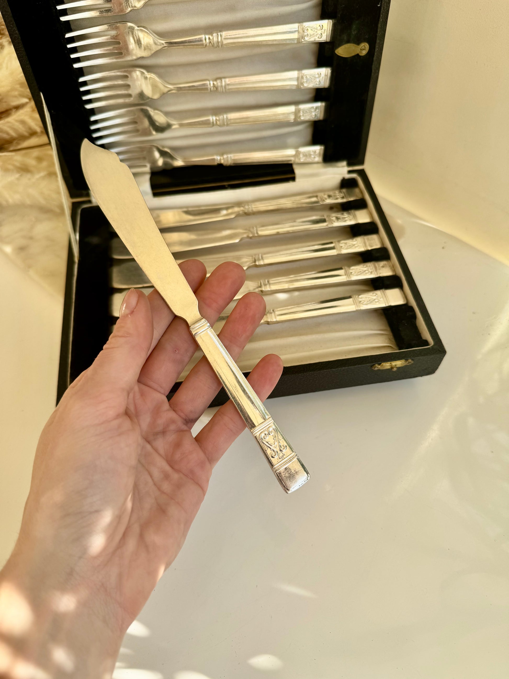 A beautifully preserved vintage flatware set from England, crafted by Mosby & Eakin. This 12-piece set includes six forks and six matching knives, all adorned with elegant handle detailing and housed in the original black case with cream satin lining.