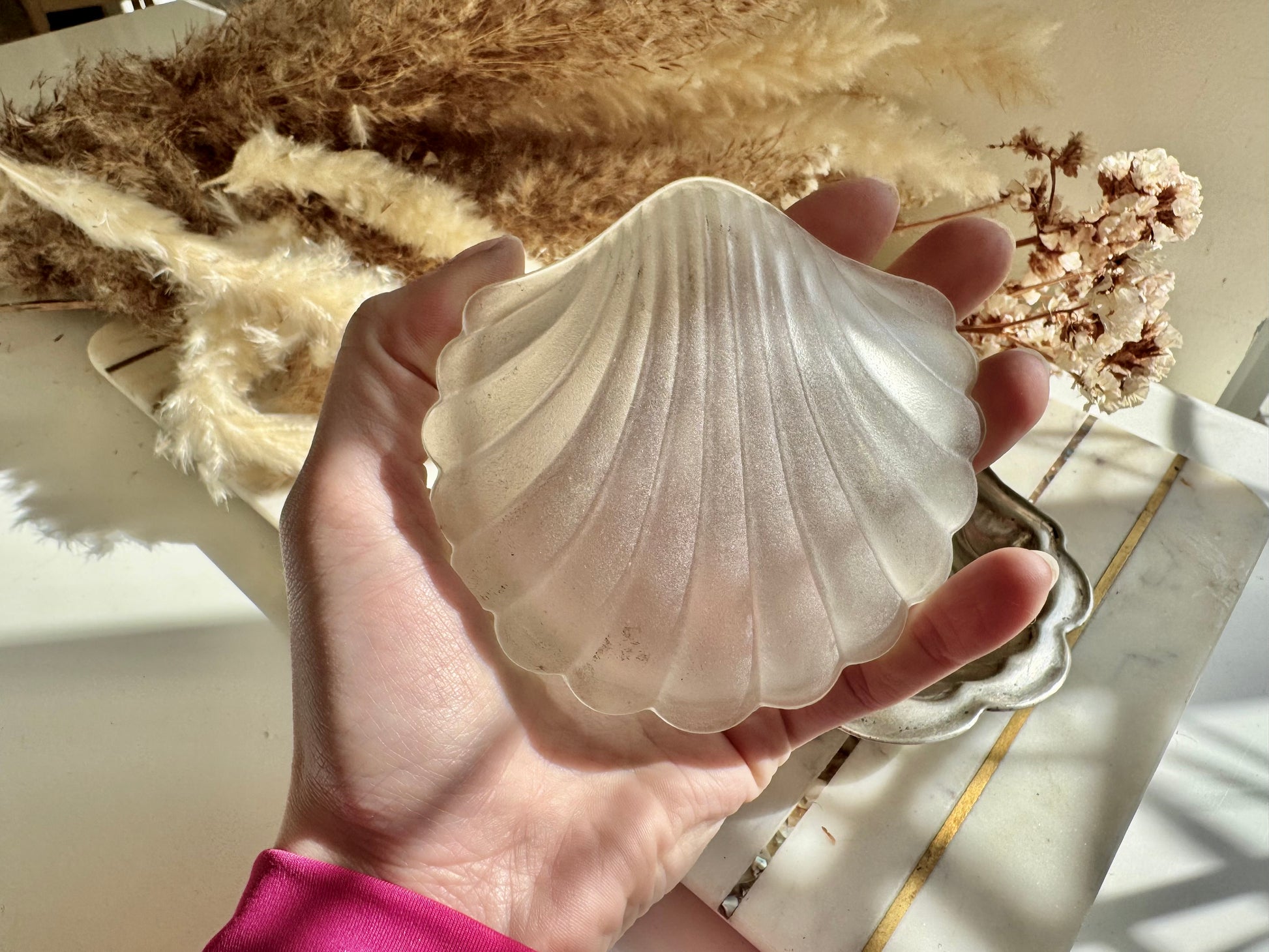 Elegant vintage shell-shaped serving dish featuring a frosted glass liner and a silver-plated base with a scalloped rim. The glass insert lifts out for easy cleaning. A beautiful piece for serving sweets or as a decorative vanity tray.