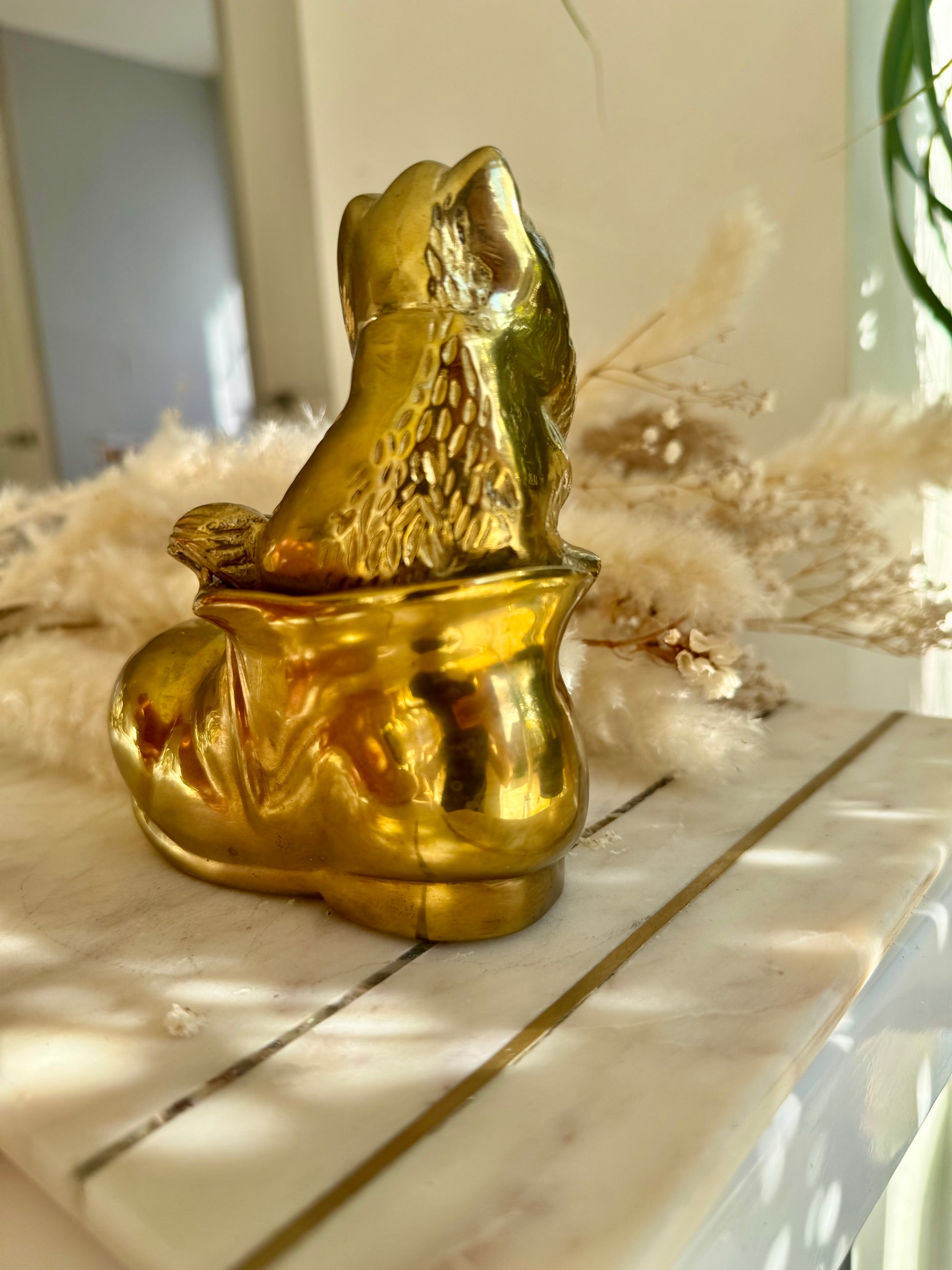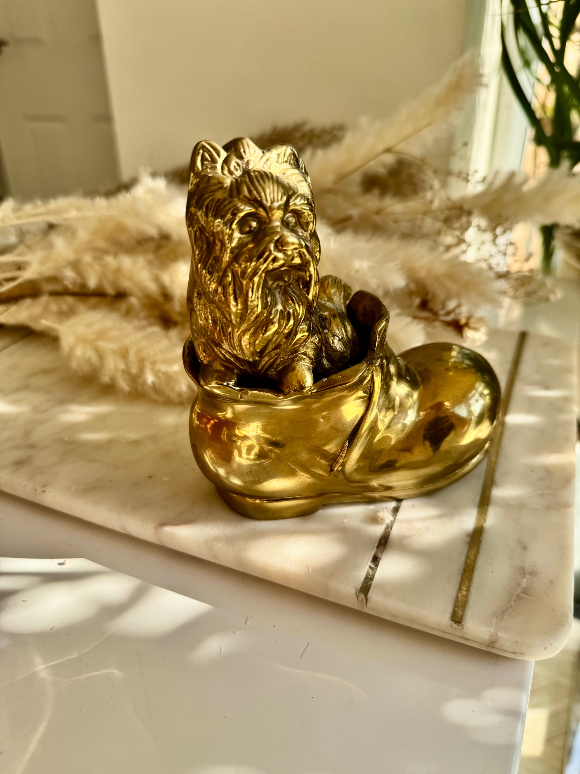 A vintage solid brass figurine featuring a Yorkshire Terrier nestled inside a boot — equal parts charming and eccentric. The dog’s detailed coat and gentle expression contrast delightfully with the oversized shoe, creating a playful tableau that feels plucked from a storybook shelf.