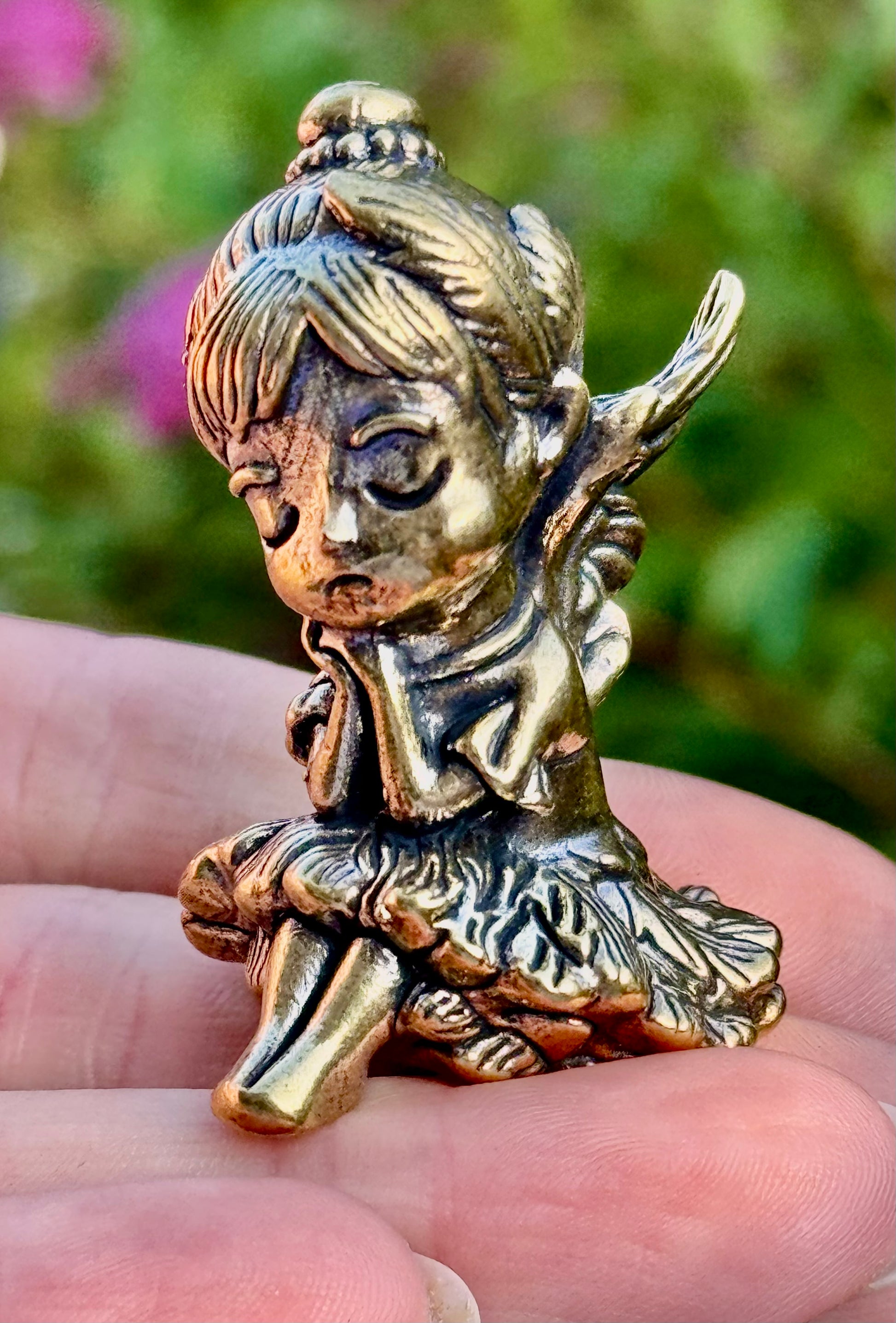 A dreamy little figure cast in solid brass — this tiny fairy girl rests with eyes closed and hands gently clasped, as if caught mid-wish. Her ballet skirt curls like flower petals, and delicate wings rise behind her back, giving her an ethereal stillness. There’s a tender melancholy in her face, as if she’s listening to something only she can hear.
